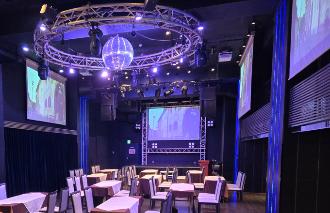 大迫力のスクリーン映像と音、照明や空間演出が重なり合う劇場空間。